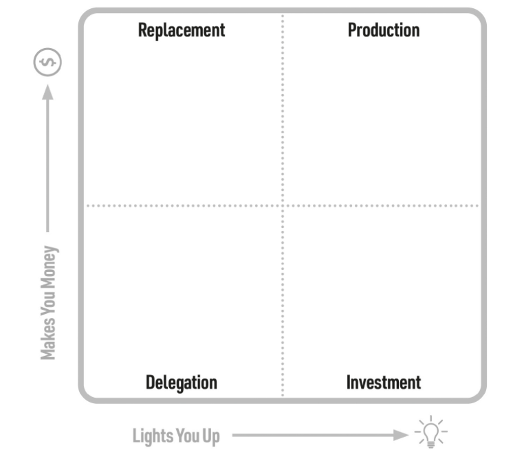 The main goal of any entrepreneur should be to do the things that make most money AND that “light you up”, and to relentlessly move towards the top-right in the DRIP-Matrix as he calls it, while always making sure you put enough time in “investing” (in health, love, spiritually, etc.). You do this by paying other people to do work in the left quadrants. Step 1: get an assistant, or someone who does work you’re just not passionate about.